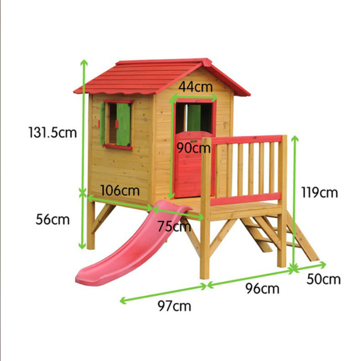 Oferujemy cały domek, wykonany z wysokiej jakości drewna pokrytego produktami odpowiednimi do długotrwałej ekspozycji na słońcu lub w deszczu. Dzięki całkowicie zaokrąglonym krawędziom i gładkiej powieszchni niedojdzie nigdy do zranienia dzieci.