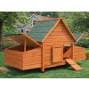 Kurnik spełnia podstawowe zadanie jakim jest ochrona przed deszczem, wiatrem i zimnem. Drewniane nogi dzięki platikowym osłonam są zabezpieczone przed niekorzystnymi warunkami atmosferycznymi. Dach jest wykonany z płyt asfaltowych, które idealnie chroni cały kurnik przed deszczem.