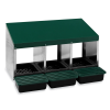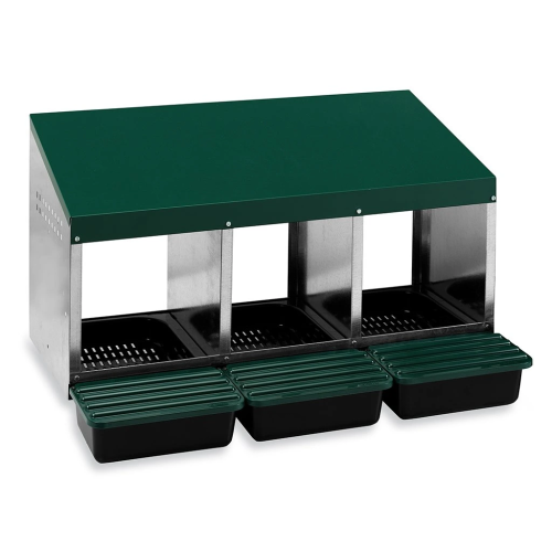 Trzyczęściowe uniewersalne gniazdo dla kur niosek. Gniazdo wykonane jest z blachy ocynkowanej w połączeniu z wytrzymałym tworzywem sztucznym. Gniazda są wyposażone w klapę do łatwego usuwania złożonych jaj. Nadaje się do umieszczenia w średnich kurnikach.