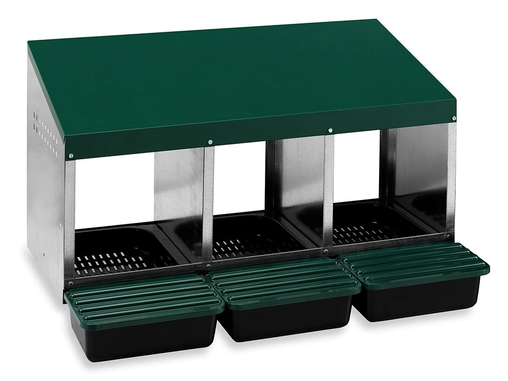 Trzyczęściowe uniewersalne gniazdo dla kur niosek. Gniazdo wykonane jest z blachy ocynkowanej w połączeniu z wytrzymałym tworzywem sztucznym. Gniazda są wyposażone w klapę do łatwego usuwania złożonych jaj. Nadaje się do umieszczenia w średnich kurnikach.